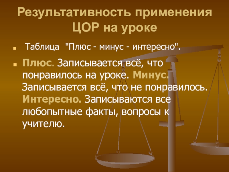 Записывается всё, что понравилось на уроке. Минус. Записывается всё, что не понравилось. Интересно. Записываются все любопытные факты, вопросы к учителю.