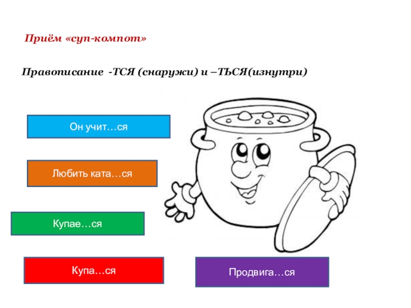 Приём «суп-компот»Правописание -ТСЯ (снаружи) и –ТЬСЯ(изнутри)Он учит…сяЛюбить ката…сяКупае…сяКупа…сяПродвига…ся