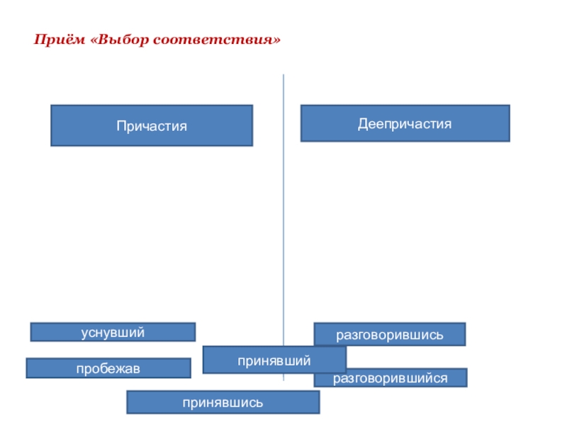 Приём «Выбор соответствия» ДеепричастияуснувшийпробежавразговорившисьразговорившийсяПричастияпринявшийпринявшись