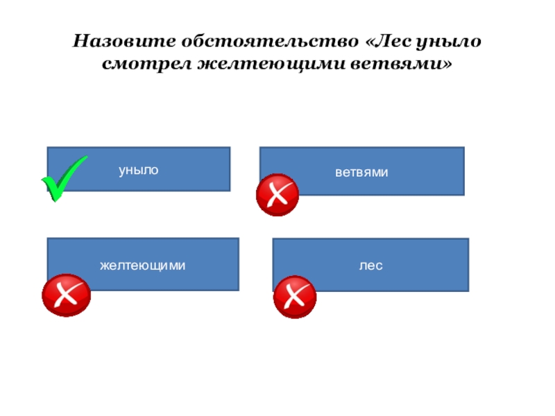 Слайд 7Назовите обстоятельство «Лес уныло смотрел желтеющими ветвями»