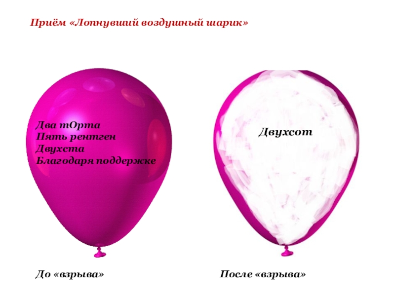 Приём «Лопнувший воздушный шарик»До «взрыва»После «взрыва»Два тОртаПять рентгенДвухстаБлагодаря поддержкеДвухсот