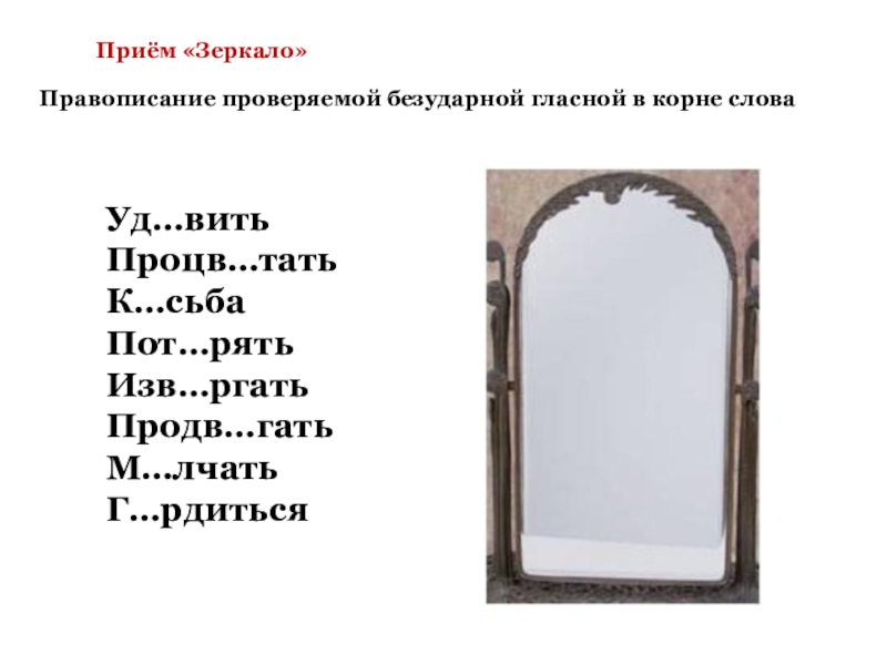 Уд…витьПроцв…татьК…сьбаПот…рятьИзв…ргатьПродв…гатьМ…лчатьГ…рдитьсяПриём «Зеркало»Правописание проверяемой безударной гласной в корне слова