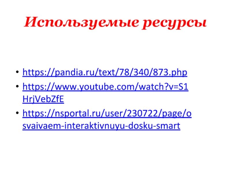 Используемые ресурсыhttps://pandia.ru/text/78/340/873.phphttps://www.youtube.com/watch?v=S1HrjVebZfEhttps://nsportal.ru/user/230722/page/osvaivaem-interaktivnuyu-dosku-smart