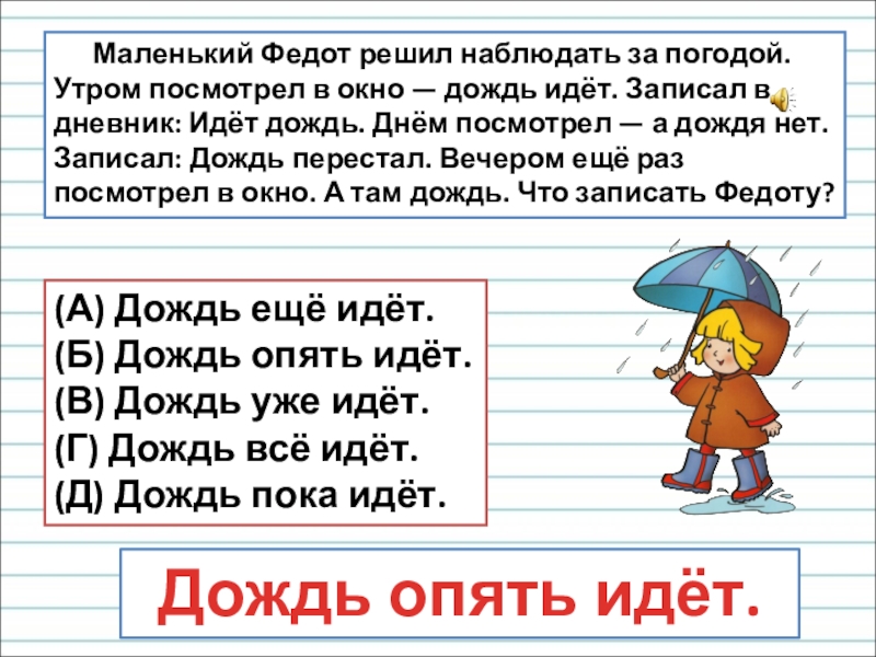 Маленький Федот решил наблюдать за погодой. Утром посмотрел в окно — дождь идёт. Записал в дневник: Идёт дождь. Днём посмотрел — а дождя нет. Записал: Дождь перестал. Вечером ещё раз посмотрел в окно. А там дождь. Что записать Федоту?