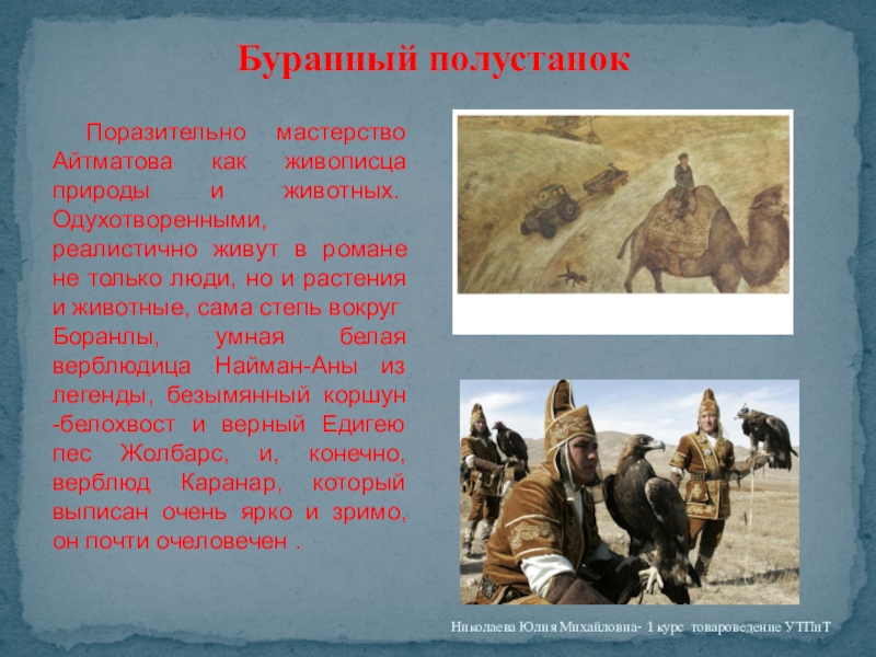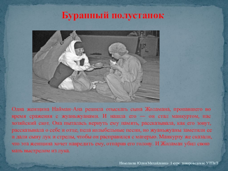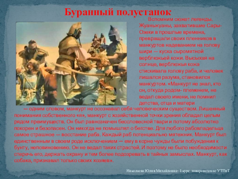 — одним словом, манкурт не осознавал себя человеческим существом. Лишенный понимания собственного «я», манкурт с хозяйственной точки зрения обладал целым рядом преимуществ. Он был равнозначен бессловесной твари и потому абсолютно покорен и безопасен. Он никогда не помышлял о бегстве. Для любого рабовладельца самое страшное — восстание раба. Каждый раб потенциально мятежник. Манкурт был единственным в своем роде исключением — ему в корне чужды были побуждения к бунту, неповиновению. Он не ведал таких страстей. И поэтому не было необходимости стеречь его, держать охрану и тем более подозревать в тайных замыслах. Манкурт, как собака, признавал только своих хозяев».