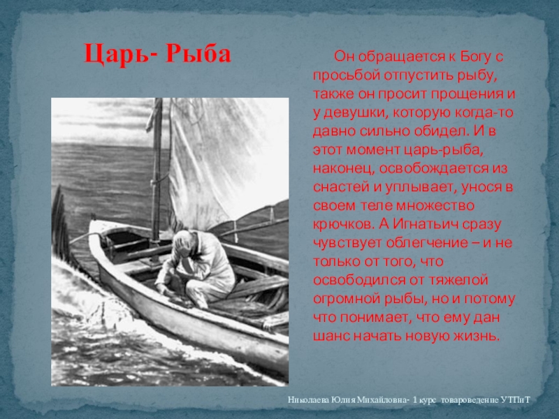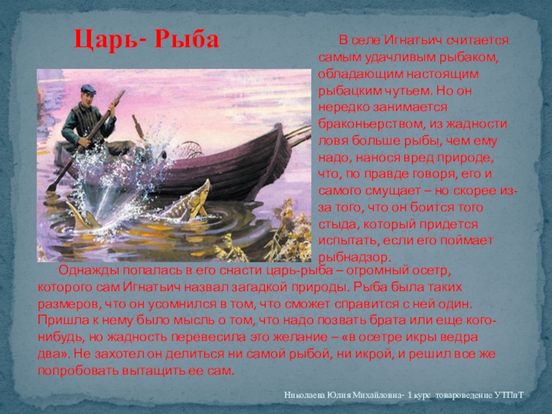 Однажды попалась в его снасти царь-рыба – огромный осетр, которого сам Игнатьич назвал загадкой природы. Рыба была таких размеров, что он усомнился в том, что сможет справится с ней один. Пришла к нему было мысль о том, что надо позвать брата или еще кого-нибудь, но жадность перевесила это желание – «в осетре икры ведра два». Не захотел он делиться ни самой рыбой, ни икрой, и решил все же попробовать вытащить ее сам.