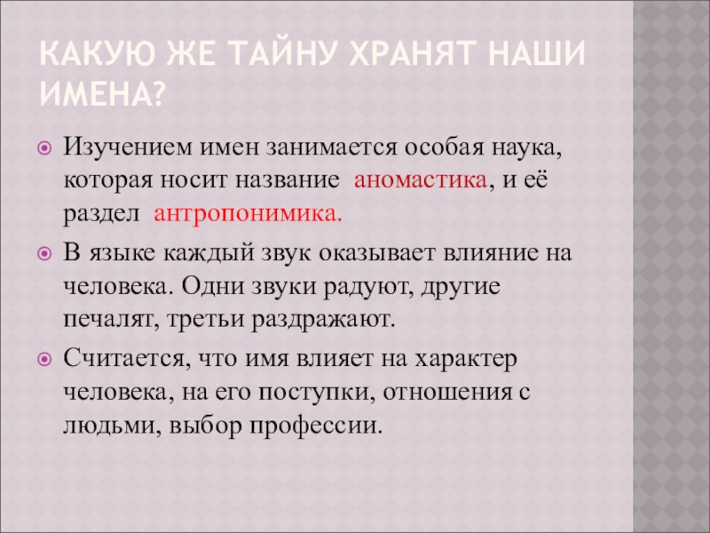 Считается, что имя влияет на характер человека, на его поступки, отношения с людьми, выбор профессии.