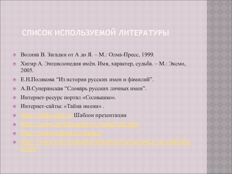 Хигир А. Энциклопедия имён. Имя, характер, судьба. – М.: Эксмо, 2005.