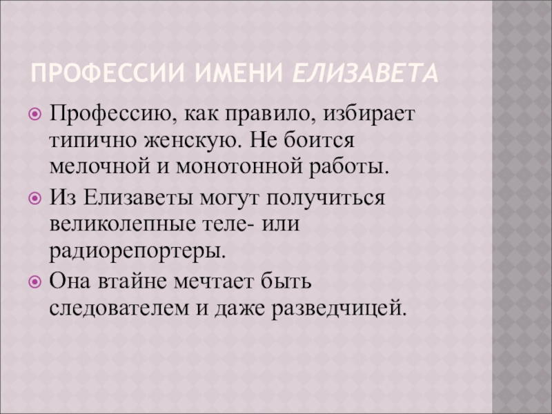 Слайд 21ПРОФЕССИИ ИМЕНИ ЕЛИЗАВЕТА