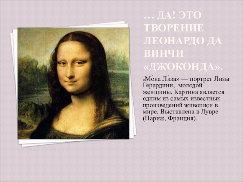 Слайд 20… ДА! ЭТО ТВОРЕНИЕ ЛЕОНАРДО ДА ВИНЧИ «ДЖОКОНДА».