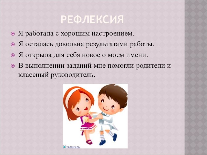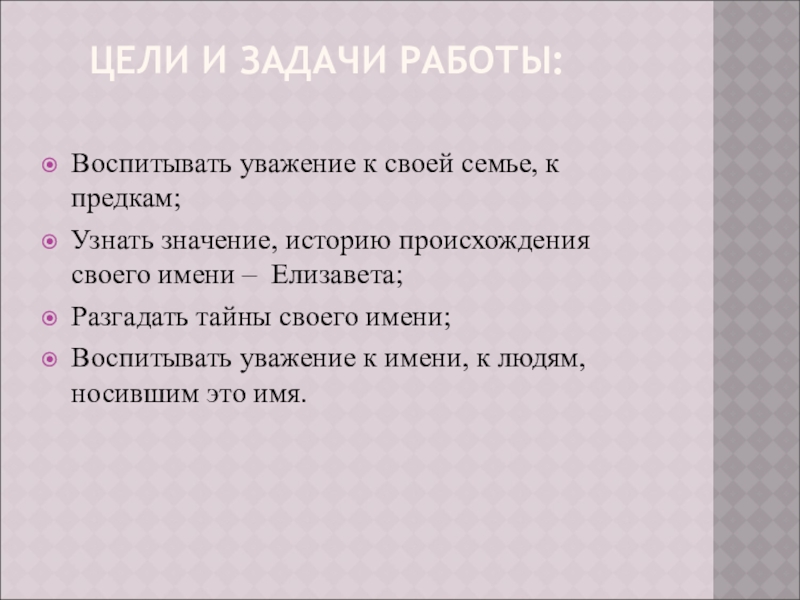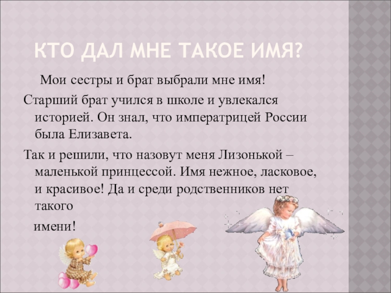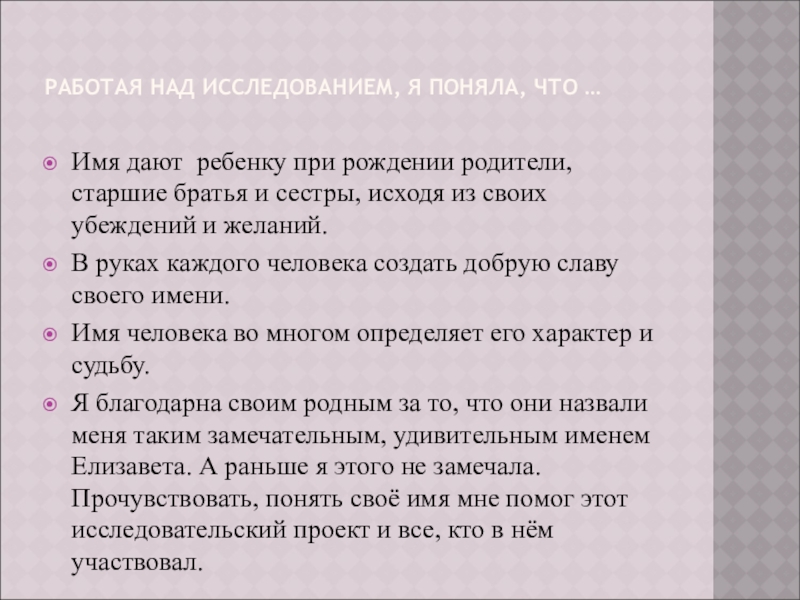 Я благодарна своим родным за то, что они назвали меня таким замечательным, удивительным именем Елизавета. А раньше я этого не замечала. Прочувствовать, понять своё имя мне помог этот исследовательский проект и все, кто в нём участвовал.