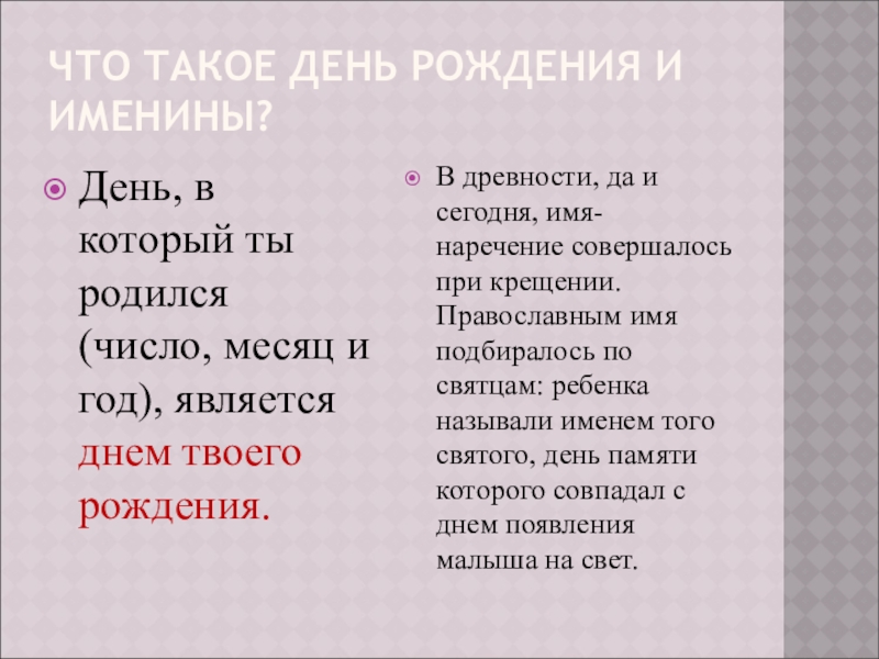 Слайд 11ЧТО ТАКОЕ ДЕНЬ РОЖДЕНИЯ И ИМЕНИНЫ?