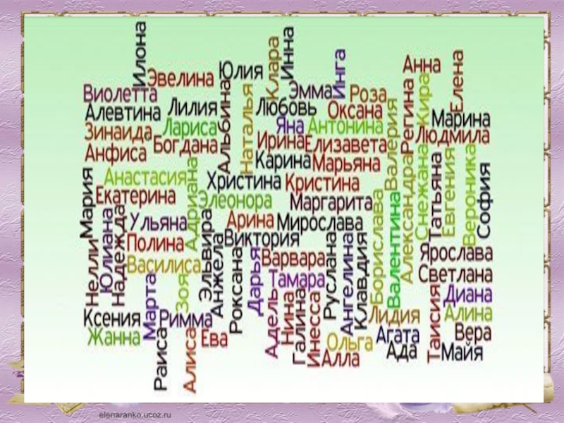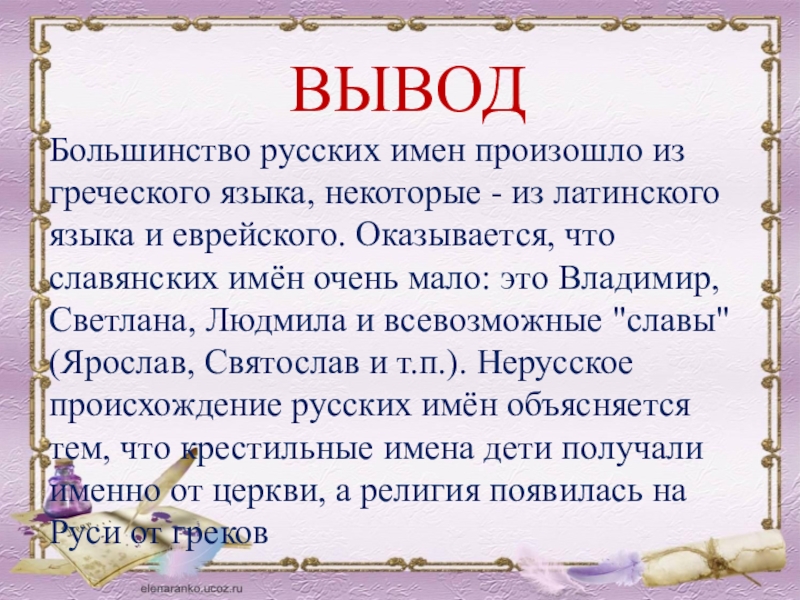 языка и еврейского. Оказывается, что славянских имён очень мало: это Владимир, Светлана, Людмила и всевозможные "славы" (Ярослав, Святослав и т.п.). Нерусское происхождение русских имён объясняется тем, что крестильные имена дети получали именно от церкви, а религия появилась на Руси от греков