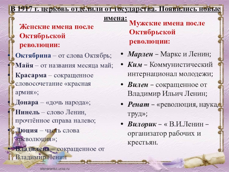 В 1917 г. церковь отделили от государства. Появились новые имена: