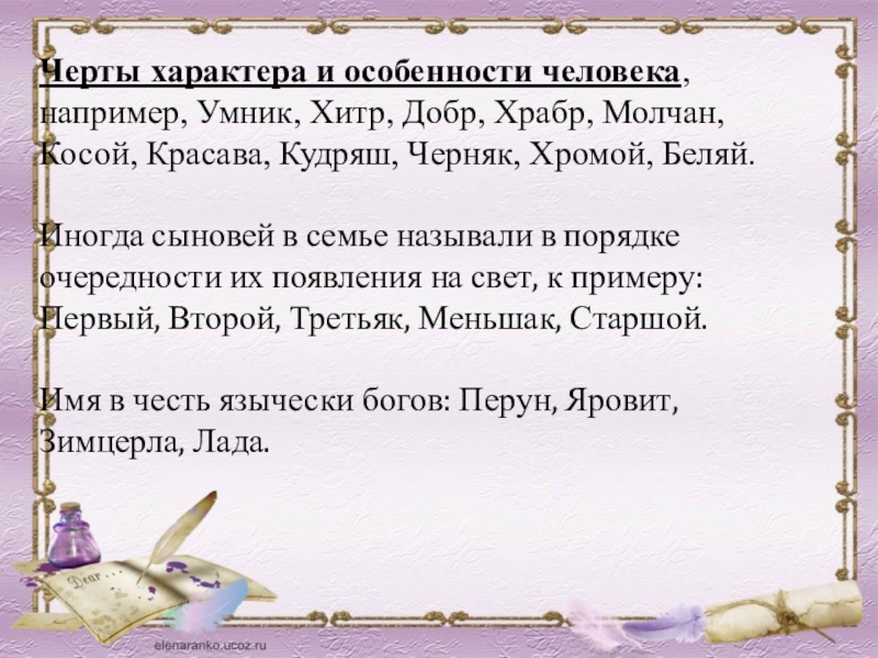Слайд 7Черты характера и особенности человека, например, Умник, Хитр, Добр, Храбр, Молчан,