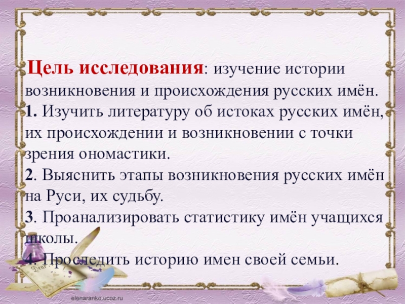 Слайд 5 Цель исследования: изучение истории возникновения и происхождения русских имён.