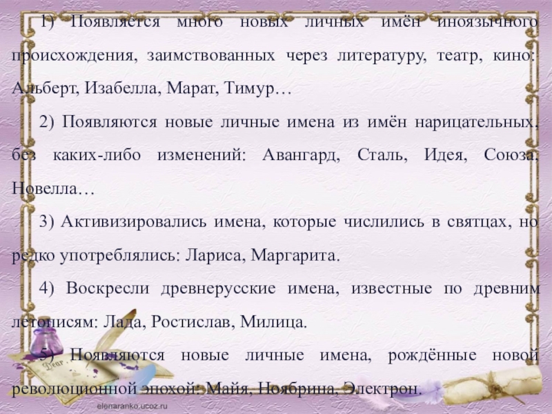Слайд 211) Появляется много новых личных имён иноязычного происхождения, заимствованных через литературу,