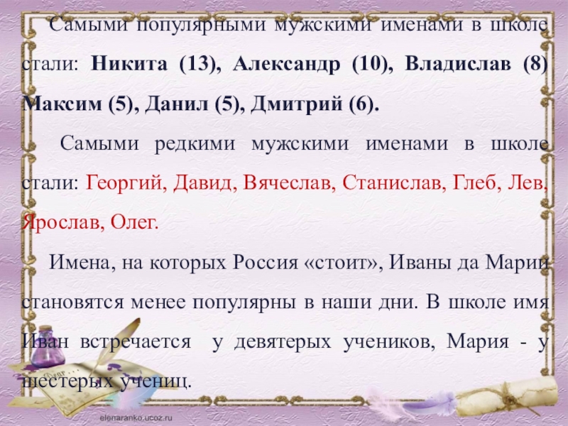 Самыми редкими мужскими именами в школе стали: Георгий, Давид, Вячеслав, Станислав, Глеб, Лев, Ярослав, Олег.