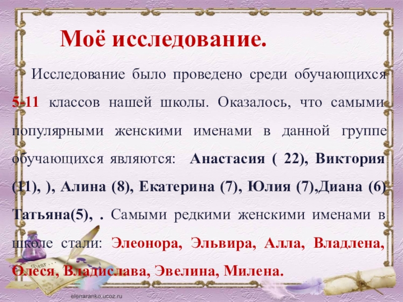 что самыми популярными женскими именами в данной группе обучающихся являются: Анастасия ( 22), Виктория (11), ), Алина (8), Екатерина (7), Юлия (7),Диана (6) Татьяна(5), . Самыми редкими женскими именами в школе стали: Элеонора, Эльвира, Алла, Владлена, Олеся, Владислава, Эвелина, Милена.