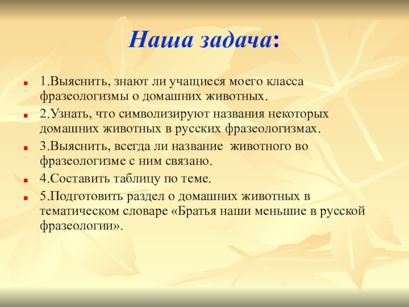 1.Выяснить, знают ли учащиеся моего класса фразеологизмы о домашних животных.