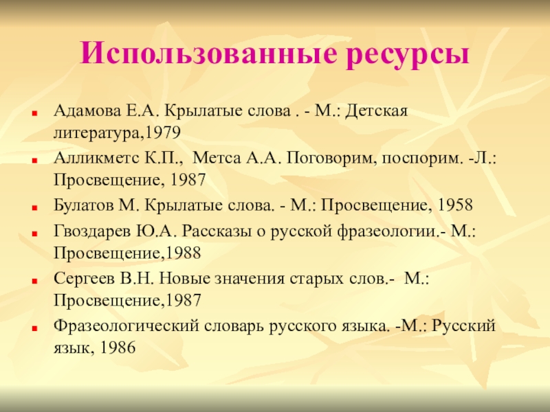 Адамова Е.А. Крылатые слова . - М.: Детская литература,1979