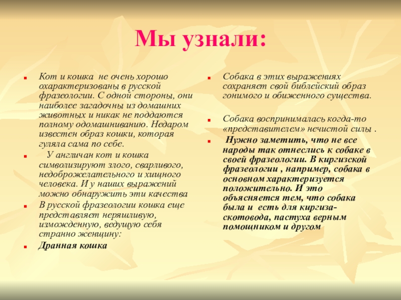 Нужно заметить, что не все народы так отнеслись к собаке в своей фразеологии. В киргизской фразеологии , например, собака в основном характеризуется положительно. И это объясняется тем, что собака была и есть для киргиза-скотовода, пастуха верным помощником и другом