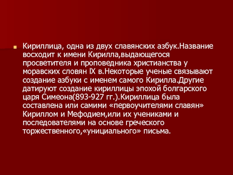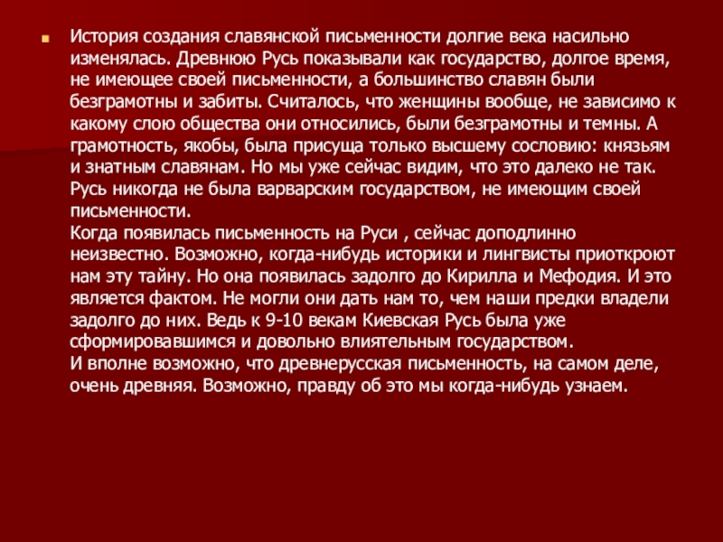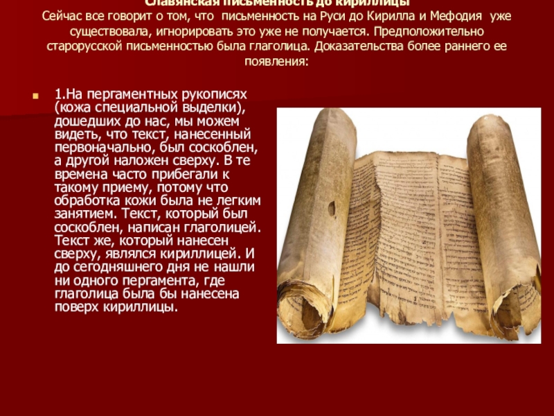 1.На пергаментных рукописях (кожа специальной выделки), дошедших до нас, мы можем видеть, что текст, нанесенный первоначально, был соскоблен, а другой наложен сверху. В те времена часто прибегали к такому приему, потому что обработка кожи была не легким занятием. Текст, который был соскоблен, написан глаголицей. Текст же, который нанесен сверху, являлся кириллицей. И до сегодняшнего дня не нашли ни одного пергамента, где глаголица была бы нанесена поверх кириллицы.