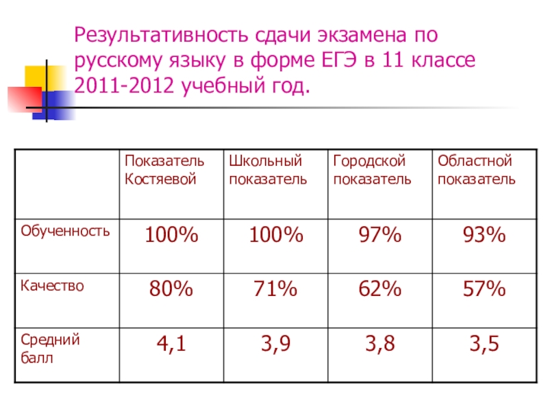 Слайд 18Результативность сдачи экзамена по русскому языку в форме ЕГЭ в 11