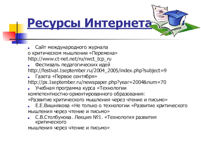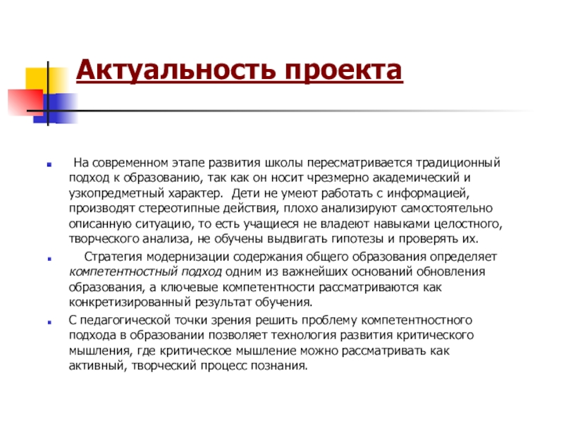С педагогической точки зрения решить проблему компетентностного подхода в образовании позволяет технология развития критического мышления, где критическое мышление можно рассматривать как активный, творческий процесс познания.