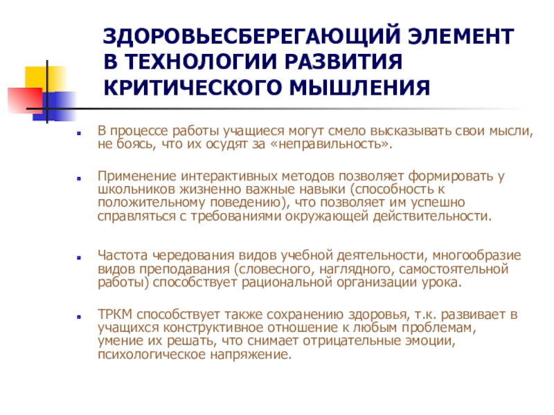 Слайд 12ЗДОРОВЬЕСБЕРЕГАЮЩИЙ ЭЛЕМЕНТ В ТЕХНОЛОГИИ РАЗВИТИЯ КРИТИЧЕСКОГО МЫШЛЕНИЯ