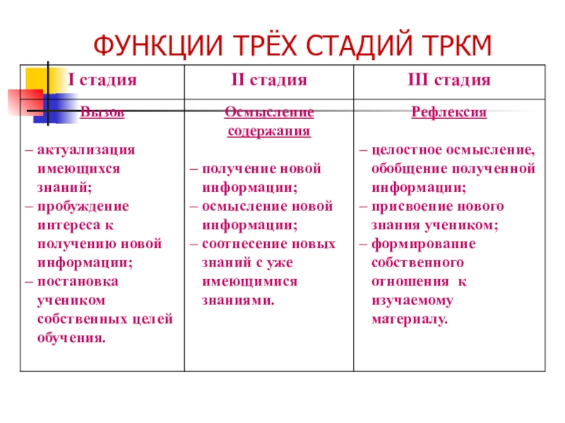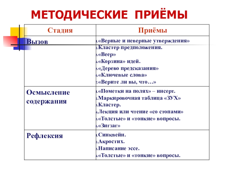 «вызов – осмысление содержания – рефлексия» позволяет учителю работать в режиме свободного творчества, используя как приёмы ТРКМ, так и классические.