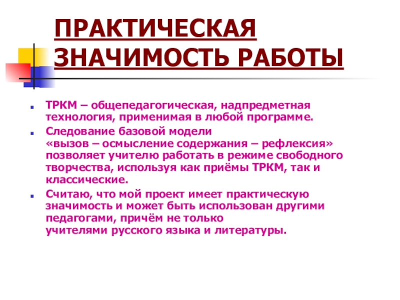 ТРКМ – общепедагогическая, надпредметная технология, применимая в любой программе.