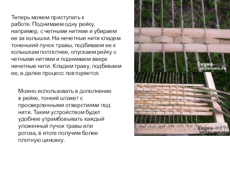 Можно использовать в дополнение в рейке, тонкий штакет с просверленными отверстиями под нити. Таким устройством будет удобнее утрамбовывать каждый уложенный пучок травы или рогоза, в итоге получим более плотную циновку.