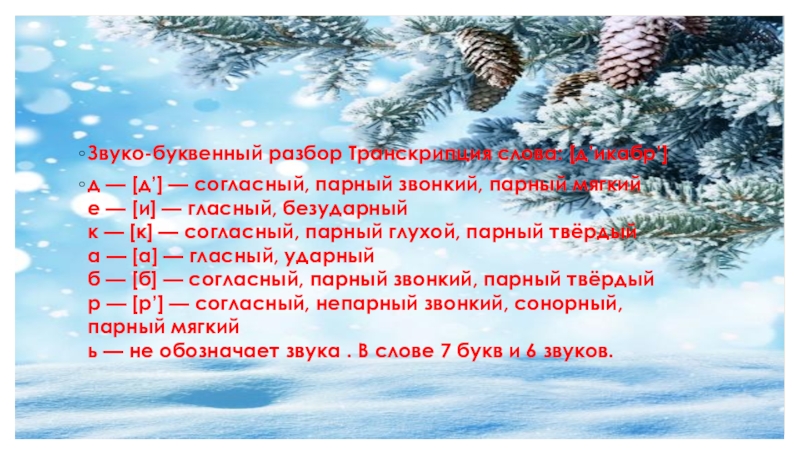 Слайд 13Звуко-буквенный разбор Транскрипция слова: [д’икабр’]