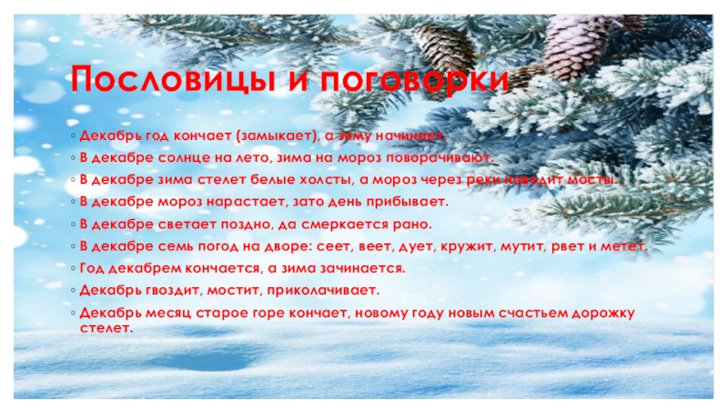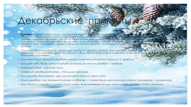 имеет другое название - «студень». В декабре обычно выпадает много снега, могут ударить сильные морозы. Невозможно передать словами эту красоту, когда деревья покрываются инеем – вы попадаете в настоящую зимнюю сказку. Про последний месяц года записано много пословиц и поговорок. «Декабрь год кончает, зиму начинает», - говорят в народе. Также на протяжении многих столетий было составлено немало народных примет декабря, по которым можно гадать о предстоящей погоде, урожае.