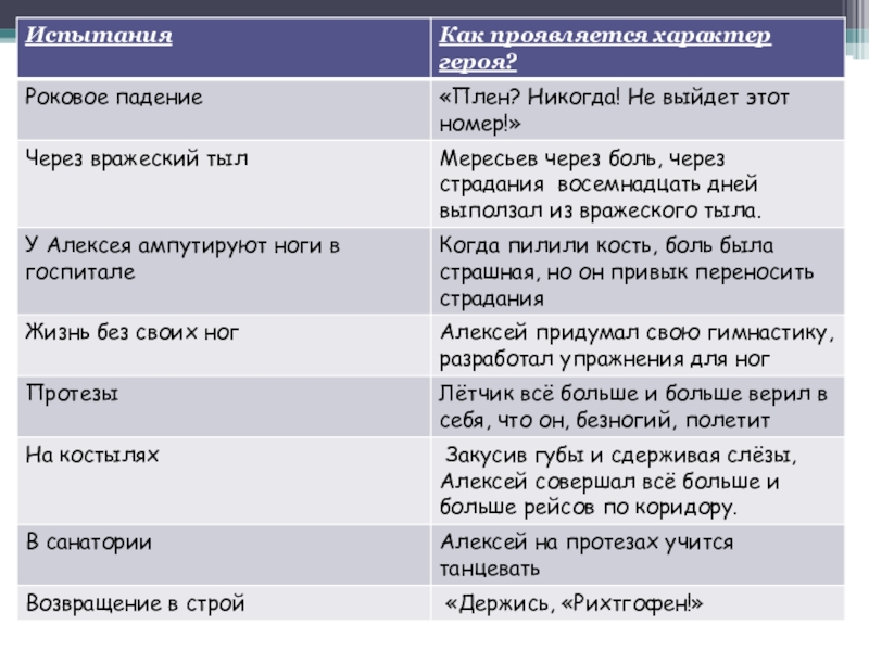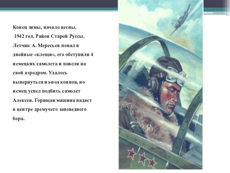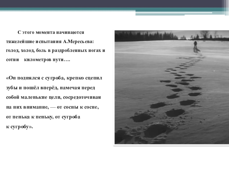Слайд 8 С этого момента начинаются тяжелейшие испытания А.Мересьева: голод, холод, боль в