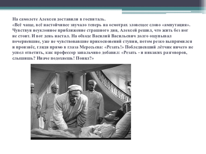на осмотрах зловещее слово «ампутация». Чувствуя неуклонное приближение страшного дня, Алексей решил, что жить без ног не стоит. И вот день настал. На обходе Василий Васильевич долго ощупывал почерневшие, уже не чувствовавшие прикосновений ступни, потом резко выпрямился и произнёс, глядя прямо в глаза Мересьева: «Резать!» Побледневший лётчик ничего не успел ответить, как профессор запальчиво добавил: «Резать - и никаких разговоров, слышишь? Иначе подохнешь! Понял?»
