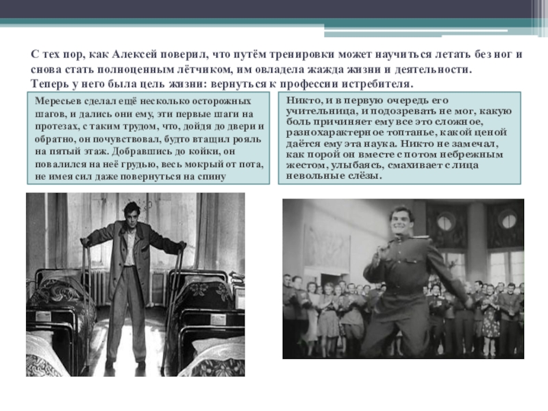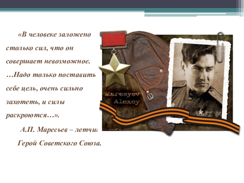 Петрович Маресьев, Герой Советского Союза. 4 апреля 1942 года в воздушном бою истребитель Маресьева был подбит. Он попытался совершить посадку на лед замерзшего озера, но рано выпустил шасси. Самолет стал быстро терять высоту и упал на лес. 18 суток Маресьев добирался ползком до своих. Он обморозил ступни ног и их пришлось ампутировать. Однако летчик решил не сдаваться. Когда ему сделали протезы, он долго и упорно тренировался и добился разрешения вернуться в строй. 24 августа 1943 года Указом Президиума Верховного Совета СССР гвардии старшему лейтенанту Маресьеву было присвоено звание Героя Советского Союза.