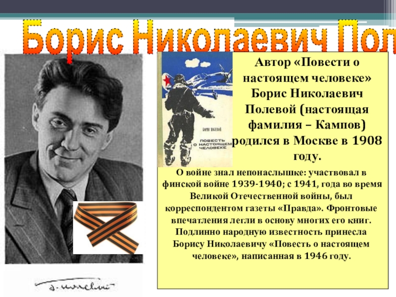 Автор «Повести о настоящем человеке» Борис Николаевич Полевой (настоящая фамилия – Кампов) родился в Москве в 1908 году.