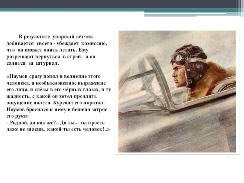 «Наумов сразу понял и волнение этого человека, и необыкновенное выражение его лица, и слёзы в его чёрных глазах, и ту жадность, с какой он хотел продлить ощущение полёта. Курсант его поразил. Наумов бросился к нему и бешено затряс его руки: