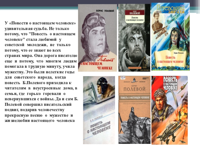 странах мира. Она дорога писателю еще и потому, что многим людям помогала в трудную минуту, учила мужеству. Это были нелегкие годы для советского народа, когда повесть Б.Полевого приходила к читателям в неустроенные дома, в семьи, где горько горевали о невернувшихся с войны. Да и сам Б.Полевой совершил писательский подвиг, подарив человечеству прекрасную песню о мужестве и жизнелюбии настоящего человека