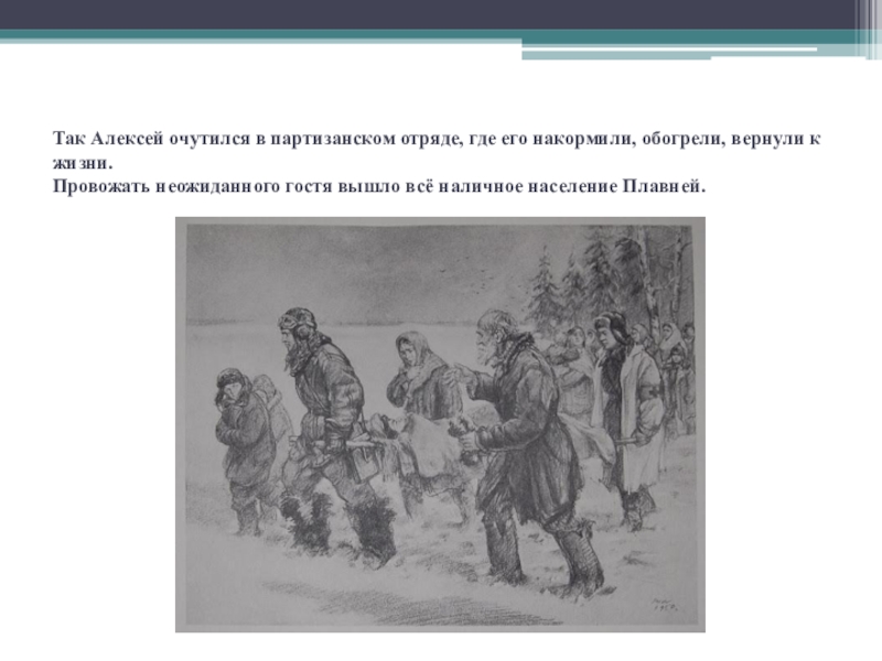 Слайд 12Так Алексей очутился в партизанском отряде, где его накормили, обогрели, вернули
