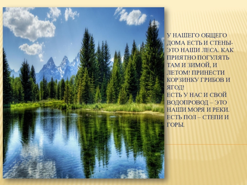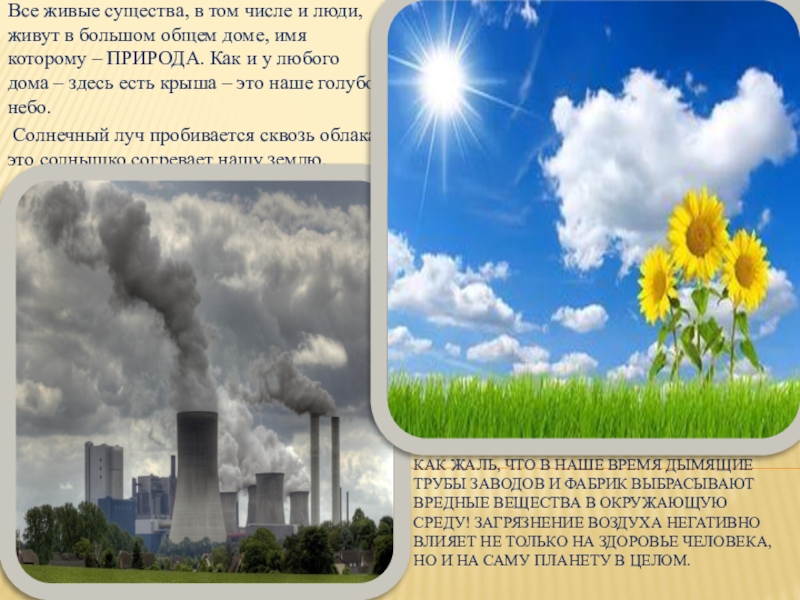 Все живые существа, в том числе и люди, живут в большом общем доме, имя которому – ПРИРОДА. Как и у любого дома – здесь есть крыша – это наше голубое небо.