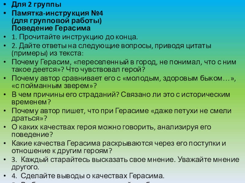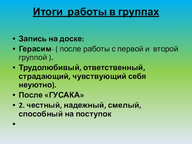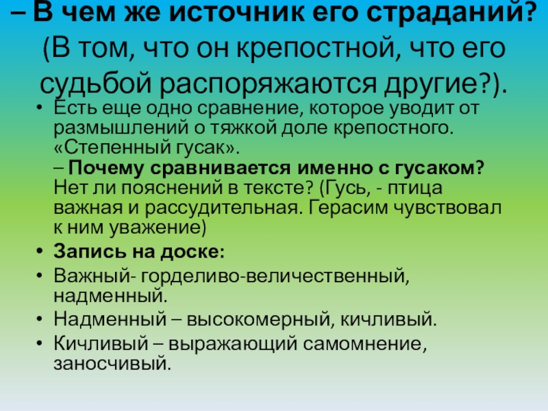 – Почему сравнивается именно с гусаком? Нет ли пояснений в тексте? (Гусь, - птица важная и рассудительная. Герасим чувствовал к ним уважение)