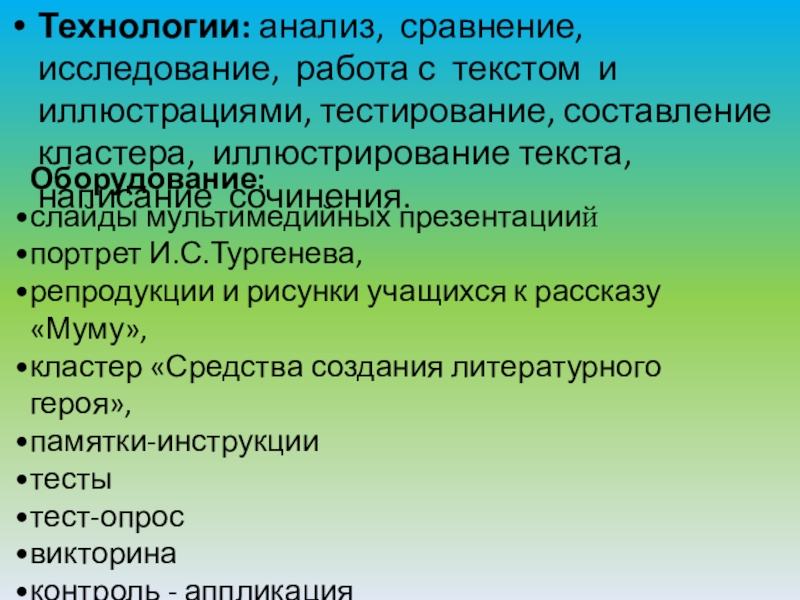 Слайд 5Технологии: анализ, сравнение, исследование, работа с текстом и иллюстрациями, тестирование, составление