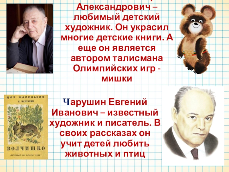 Чарушин Евгений Иванович – известный художник и писатель. В своих рассказах он учит детей любить животных и птиц