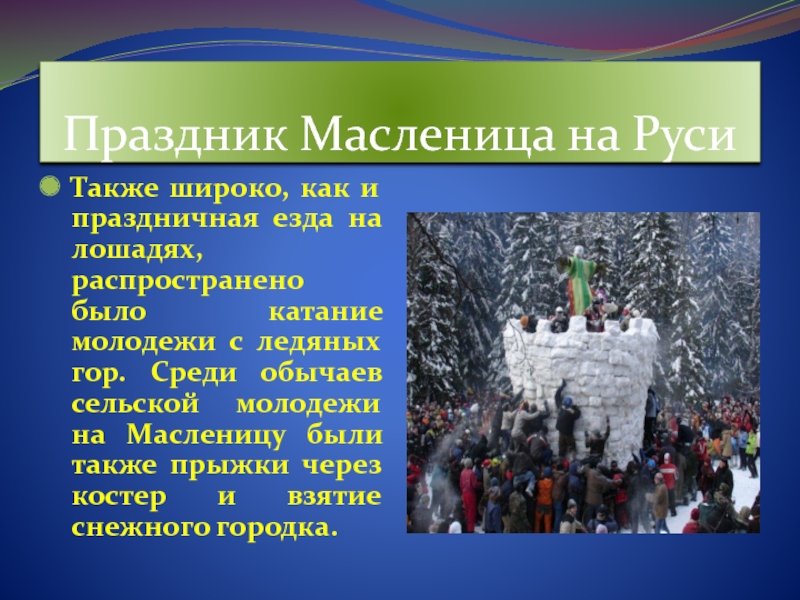 распространено было катание молодежи с ледяных гор. Среди обычаев сельской молодежи на Масленицу были также прыжки через костер и взятие снежного городка.