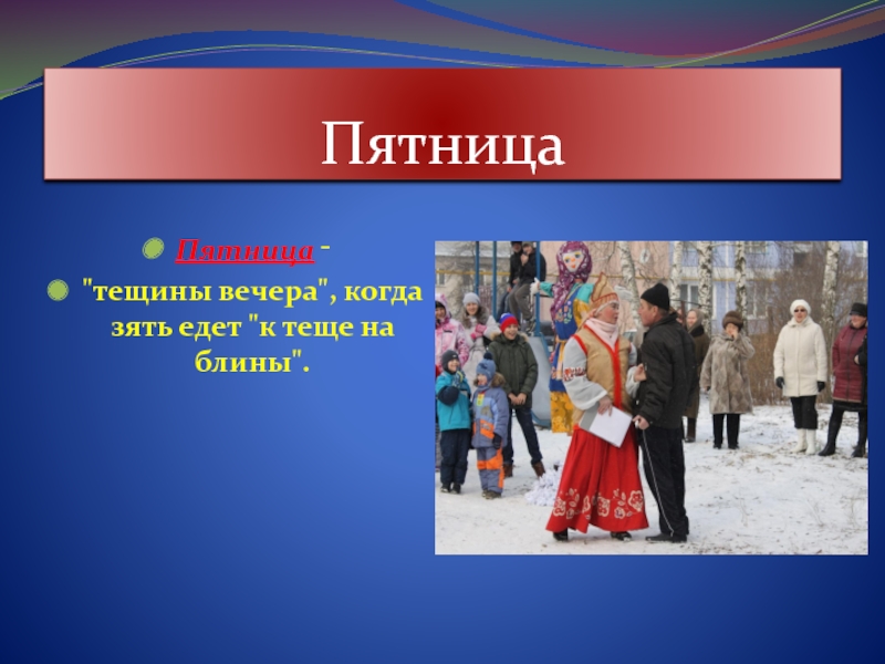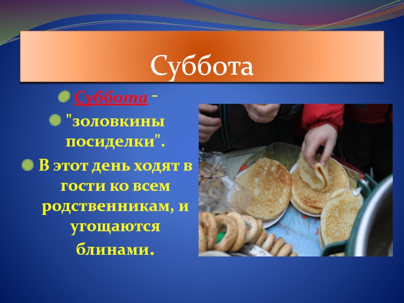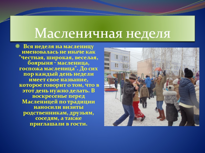 веселая, боярыня ‑ масленица, госпожа масленица". До сих пор каждый день недели имеет свое название, которое говорит о том, что в этот день нужно делать. В воскресенье перед Масленицей по традиции наносили визиты родственникам, друзьям, соседям, а также приглашали в гости.