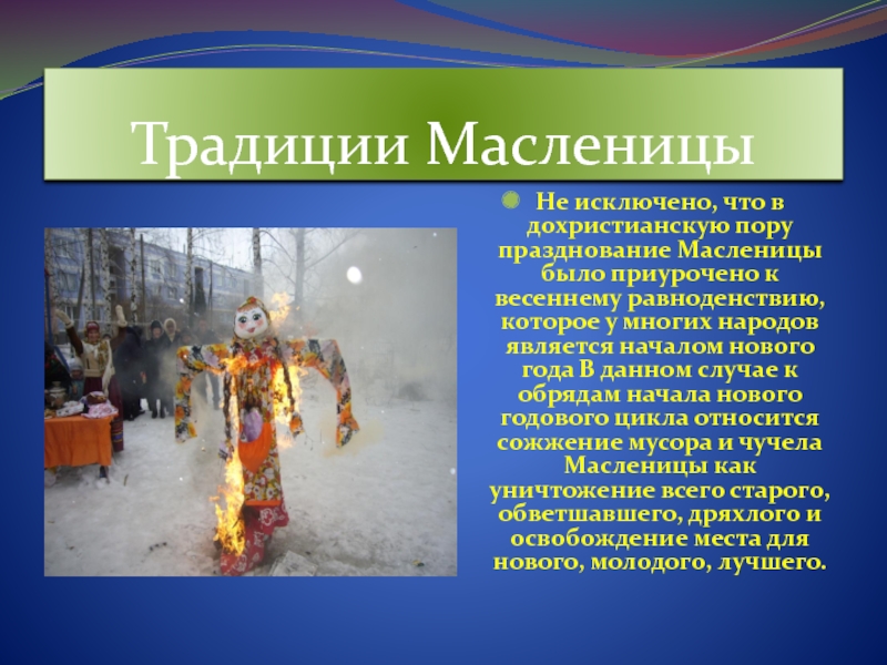 к весеннему равноденствию, которое у многих народов является началом нового года В данном случае к обрядам начала нового годового цикла относится сожжение мусора и чучела Масленицы как уничтожение всего старого, обветшавшего, дряхлого и освобождение места для нового, молодого, лучшего.