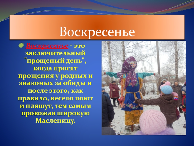 и знакомых за обиды и после этого, как правило, весело поют и пляшут, тем самым провожая широкую Масленицу.